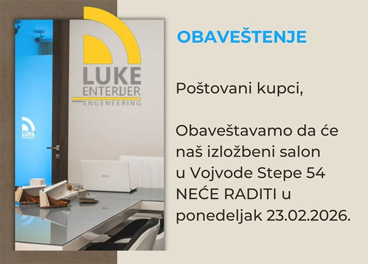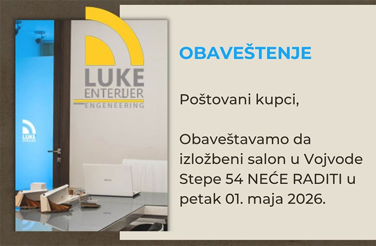 Izložbeni salon Luke enterijer-a nalazi se u Beogradu, u Ulici Vojvode Stepe 54. Tel/fax: 011/4059755. Radno vreme salona je od ponedeljka do petka od 10h do 18h.